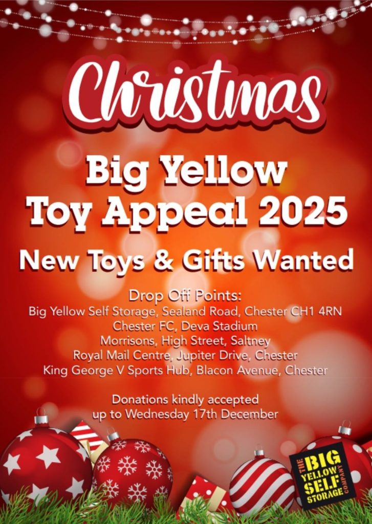Big Yellow are asking for donations of new toys and gifts for ages 0-15, with additional drop-off points at Morrison’s in Saltney, the Royal Mail on Jupiter Drive and Big Yellow Self Storage on Sealand Road.