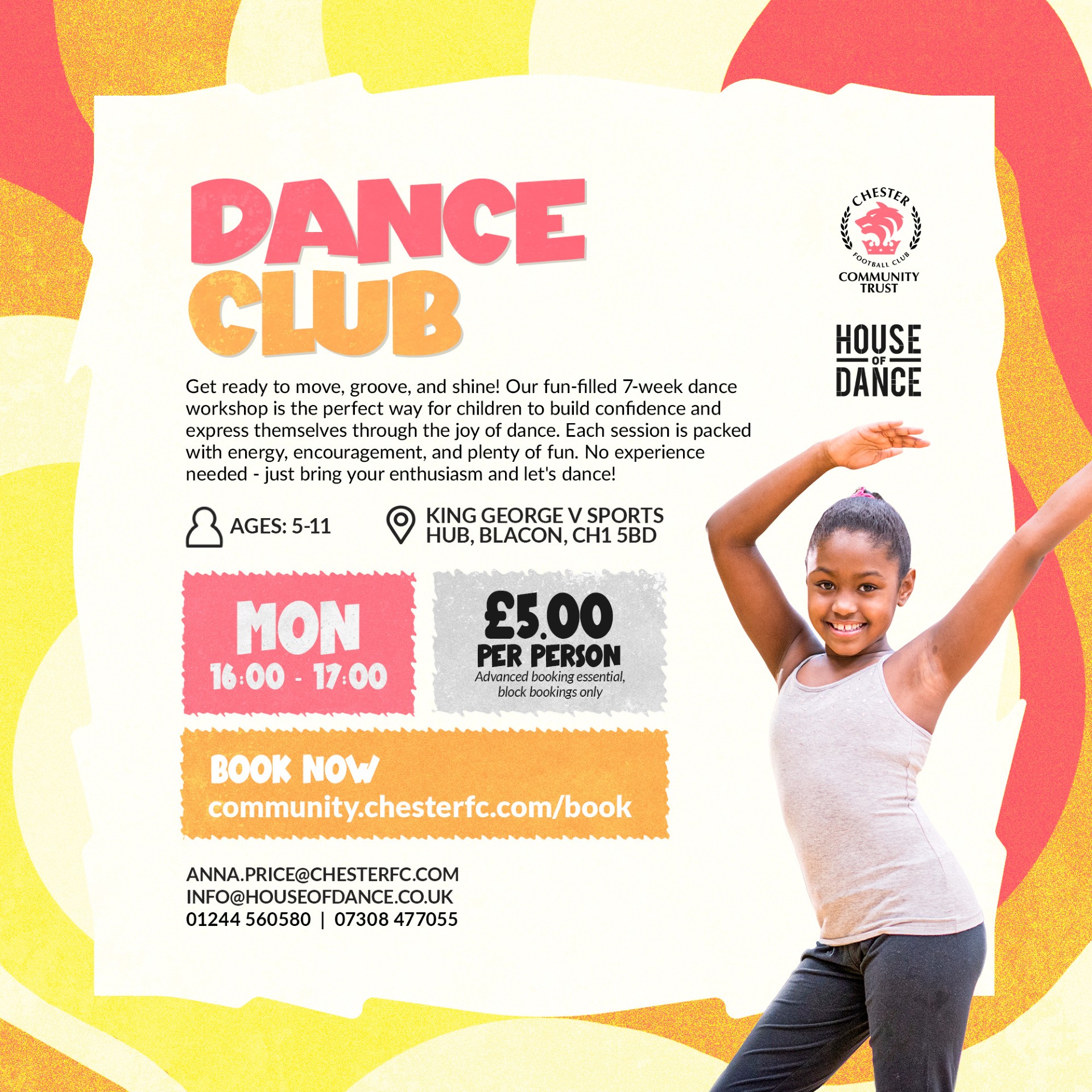 Get ready to move, groove, and express yourself – House of Dance is teaming up once again with Chester FC Community Trust to bring you an exciting After-School Dance Club at King George V Community Sports Hub! Who Can Join? Open to children aged 7–11, this fun-filled club is the perfect place for young dancers to learn, perform, and shine with the guidance of a House of Dance professional. When & Where • Starts: Monday 3rd November • Runs for: 7 weeks • Time: 16:00-17:00 (perfect for straight after school!) • Cost: £35 for the full course • Venue: King George V Community Sports Hub, Blacon Avenue, Chester CH1 5BD What to Expect Each session bursts with energy, creativity, and confidence-building fun! Children will: • Learn exciting new routines and choreography • Develop their dance skills • Enjoy opportunities to freestyle and showcase their own moves It’s all about expression, teamwork, and joy through dance – in a supportive and inspiring environment. About House of Dance Based in Chester, House of Dance offers dance, performing arts, theatre, and singing classes for children, young people, and adults of all levels and abilities. Find out more at www.houseofdance.co.uk. Book Your Place Spaces are limited – advance booking is essential! CLICK HERE TO BOOK YOUR PLACE For more details, anna.price@chesterfc.com. or info@houseofdance.co.uk.